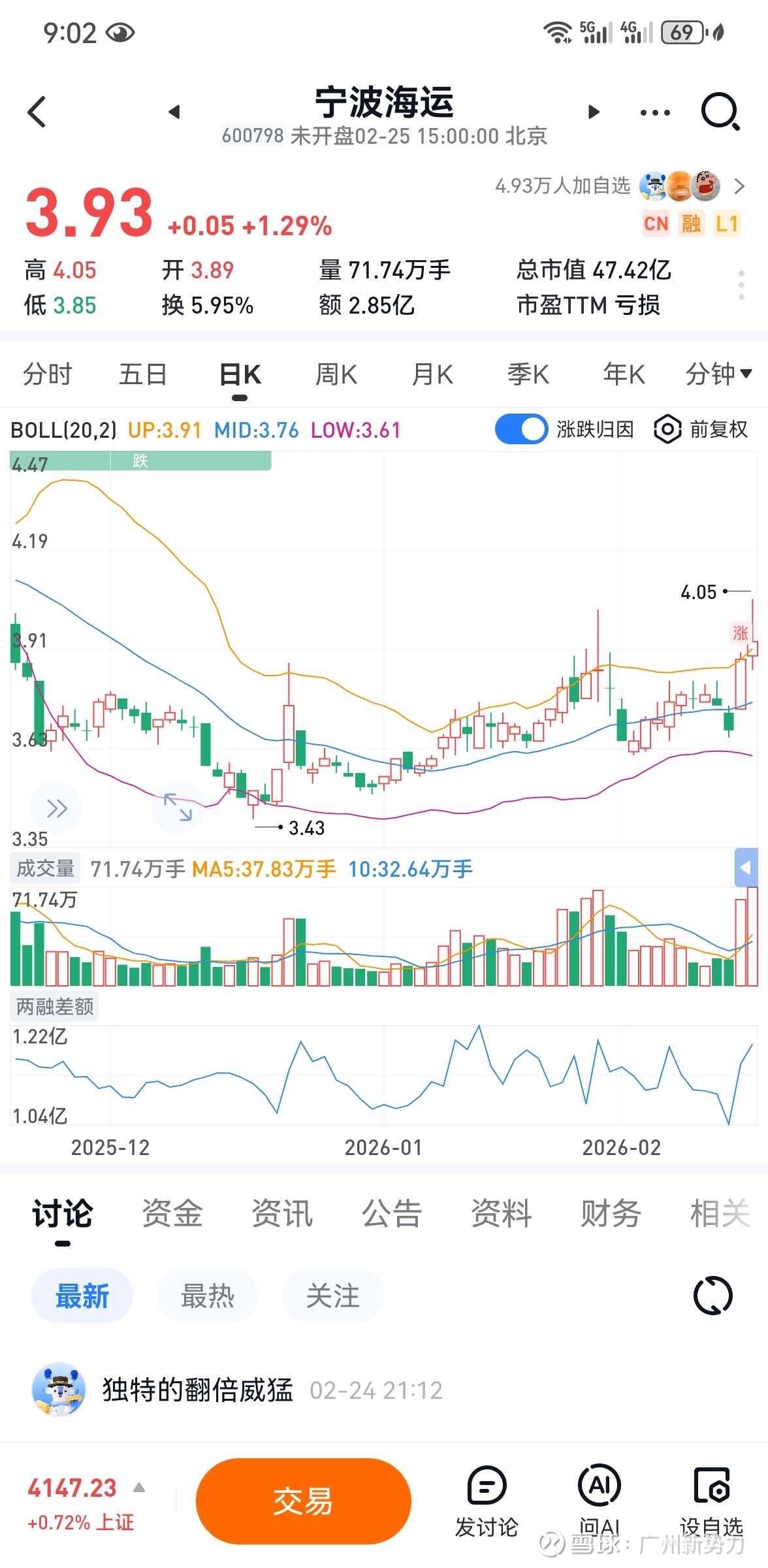 $宁波海运(SH600798)$ 股价低,目前在4元附近,公司的实控人是浙江国资委,资产负债率低,前几年持续盈利,这几天航运股持续涨停,例如$招商轮船(SH601872)$ 。宁波海运盘子小,不排除有接力的可能,就算是没有接力,这个价位应该还算可以,不大有可能深套。我选股一般选这种进可攻退可守的,除非是想做T。