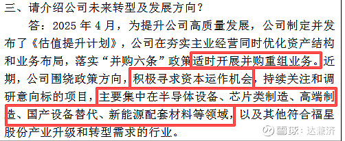1、《估值提升计划》明确提出适时开展并购重组业务,方向是半导体设备、芯片类制造、高端制造、国产设备替代、新能源配套材料等领域。$福星股份(SZ000926)$