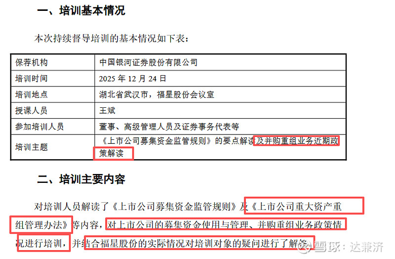 1、督导培训公告确实是例行公告,但督导培训的内容不一定是并购重组方面的,所以督导培训涉及并购重组政策解读,本身就能说明一些问题,可以看作是为未来的资本运作(如并购重组)铺平道路。$福星股份(SZ000926)$