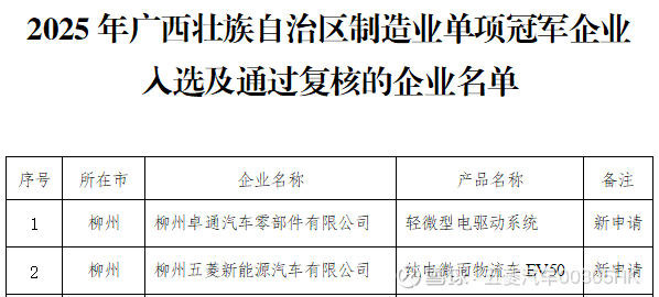 12月1日,广西壮族自治区工业和信息化厅公布“2025年广西制造业单项冠军企业名单”,五菱汽车所属柳州卓通汽车零部件有限公司、五菱汽车联营公司柳州五菱新能源汽车有限公司成功入选!