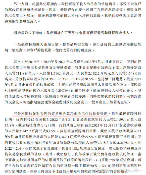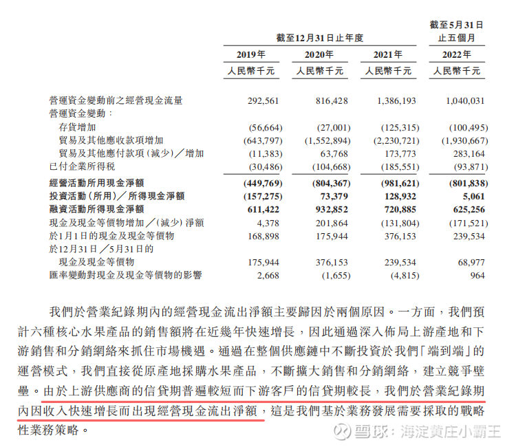 洪九的商业模式有个巨坑:“先垫钱后收款”!为了锁海外果园,要提前支付巨额预付款,下游却要给商超、批发商超长账期。结果就是经营现金流连续多年为负,2021年净流出10亿💰!利润只是纸上富贵,钱根本回不来。