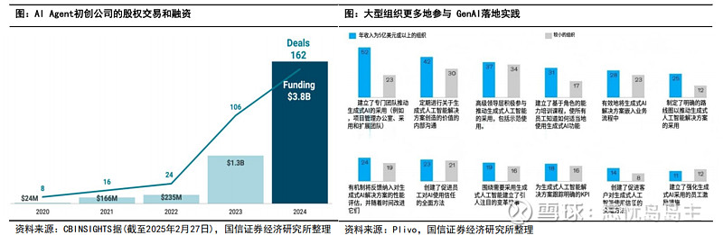 •市场规模:CBINSIGHTS统计预测2024年营收超50亿美元,预计2025年底突破100亿美元,2032年达到1036亿美元,2024-2032年CAGR 44.9%。超半数AI Agent公司2023年成立,2024年赛道融资近乎翻3倍;