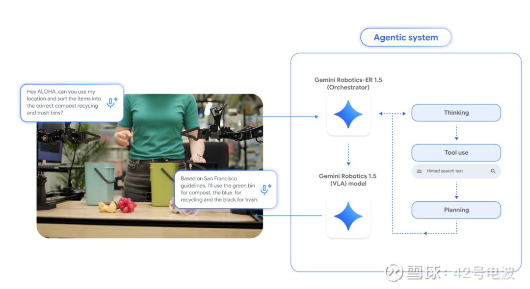 Gemini Robotics-ER 1.5 在实际应用中相当于机器人的「战略指挥官」,可通过自 然语言与人类交互,自主评估任务进度与成功率,还能调用谷歌搜索等工具获取外部信息,为复杂任务制定详细的多步骤计划,然后给每个步骤提供自然语言指令。