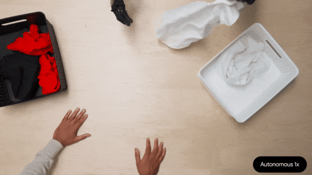 在随后的任务三中,Apollo 来分类衣物,白色的衣服要放在白色的收纳盒中,当 Apollo 拿起衣服准备放入盒子的时候,工作人员将目标盒子与其他盒子进行了位置交换,而在这个过程中,模型可以帮助 Apollo 做出及时的反应,最终顺利地完成了任务。