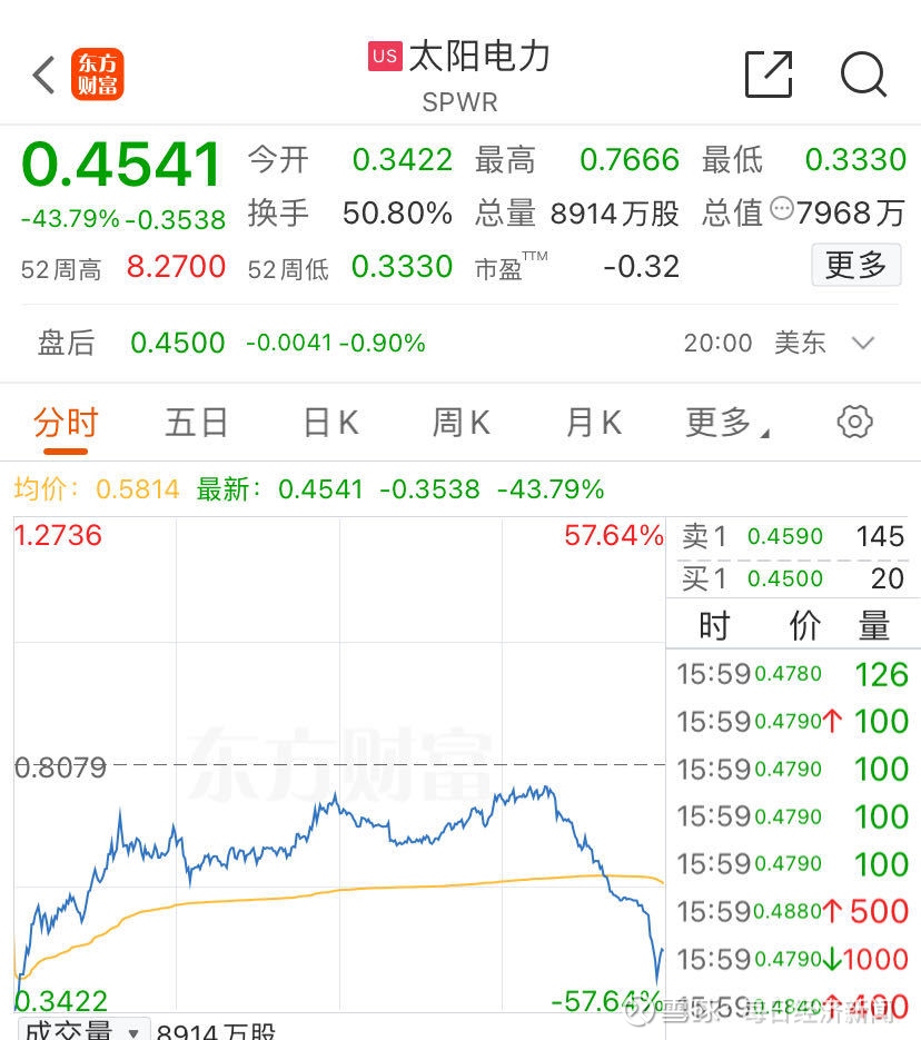 周二(8月6日)美股早盘,美国太阳能制造商SunPower(SPWR)一度跌至历史新低0.333美元,跌幅接近60%,收盘时收窄至43.79%,公司股价年初至今已跌超90%。