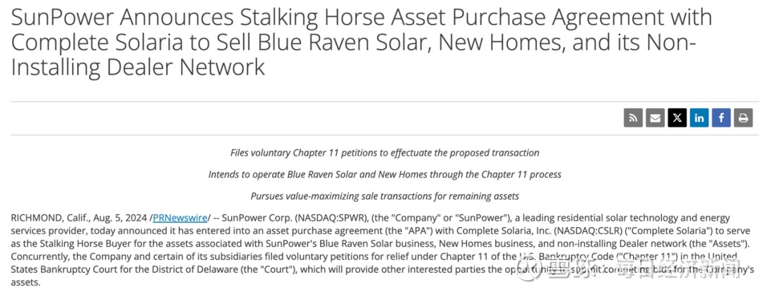 SunPower官网声明。图片来源:SunPower截图 在新闻稿中,SunPower宣布已与竞争对手Complete Solaria达成资产购买协议,后者将以4500万美元现金收购SunPower的Blue Raven Solar业务、New Homes业务和非安装经销商网络资产。