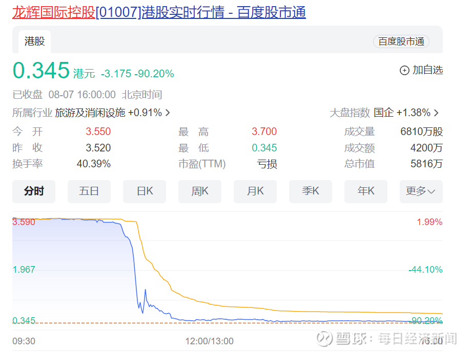 8月7日上午,上海红极一时的火锅品牌“辉哥火锅”和“小辉哥火锅”的母公司龙辉国际控股股价突然崩了,半小时内暴跌约80%。截至16时收盘,龙辉国际控股股价报收0.345港元,跌超90%,总市值只剩5816万港元。