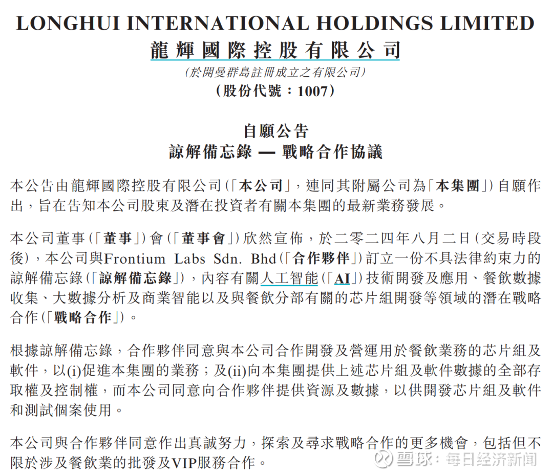 8月2日,龙辉国际控股发布公告称,与独立第三方Frontium Labs Sdn. Bhd订立谅解备忘录。据此,双方将合作开发及营运用于餐饮业务的芯片组及软件,以促进集团的业务;及向集团提供上述芯片组及软件数据的全部存取权及控制权,而公司同意向合作伙伴提供资源及数据,以供开发和测试个案使用。