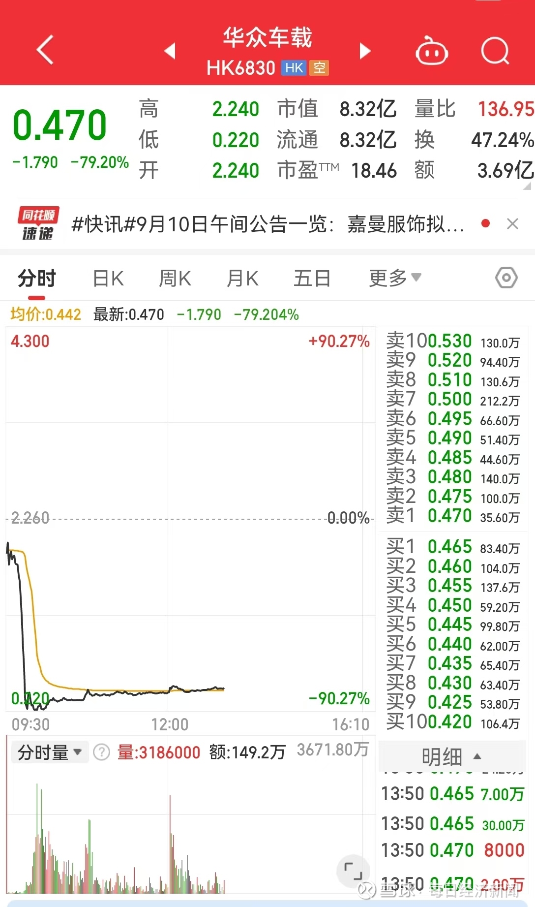 华众车载(HK6830)开盘大幅跳水,盘中一度跌近90%。截至9月10日发稿,华众车载报0.47港元,跌幅79.20%,成交额3.69亿港元。