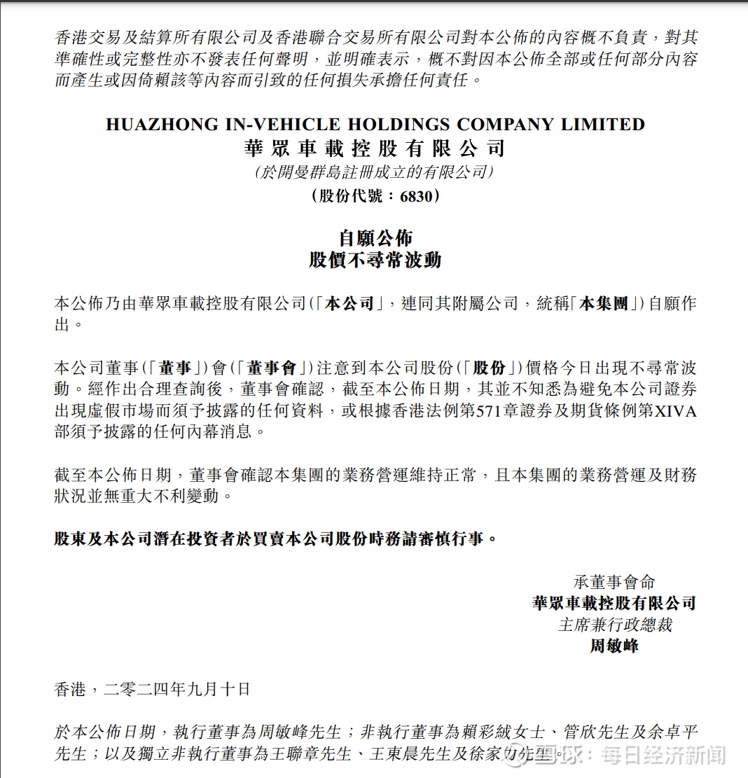 9月10日午间,华众车载发布公告紧急回应,公司董事会注意到公司股份价格今日出现不寻常波动。经作出合理查询后,董事会确认,截至公布日期,其并不知悉为避免公司证券出现虚假市场而须予披露的任何资料,或根据香港法例第571章证券及期货条例第XIVA部须予披露的任何内幕消息。