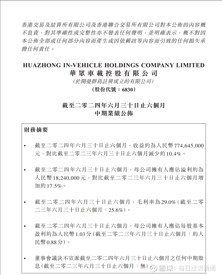 此前8月29日发布的中期业绩显示,2024年上半年,收益约为人民币7.75亿元,同比减少约10.4%;整体毛利率上升至约29.0%,母公司拥有人应占溢利约为人民币1824万元,同比增加约17.5%,每股基本盈利约为人民币1.03分。
