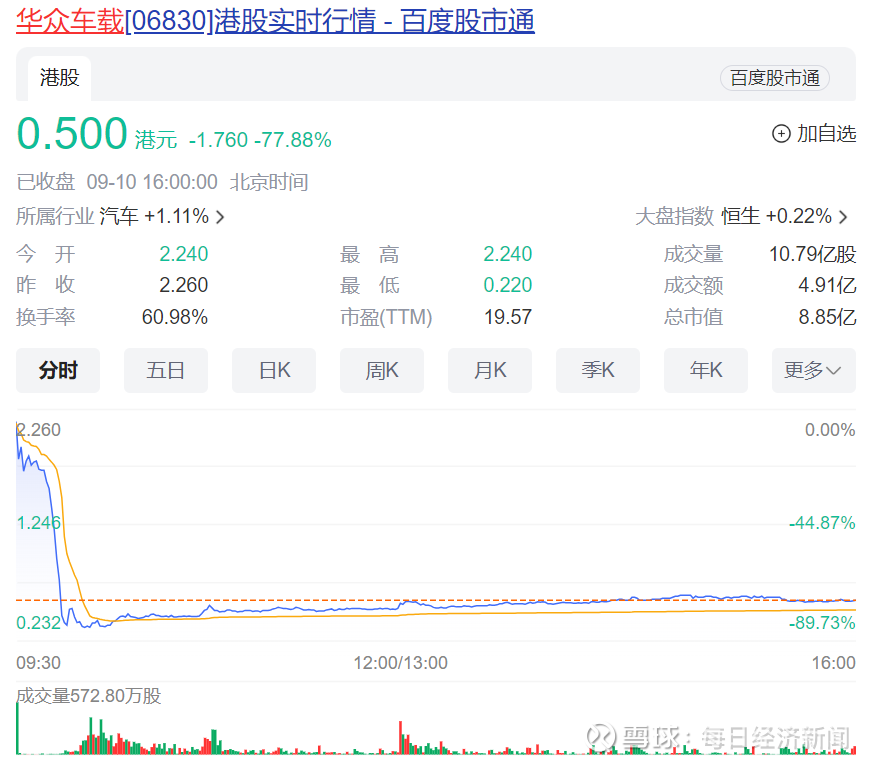 9月10日开盘,港股上市公司华众车载(06830.HK)股价闪崩,不到30分钟时间里股价暴跌近90%,与此同时,成交量也明显放大。截至收盘,华众车载跌幅收窄至77.88%,报收0.5港元,总市值仅剩8.85亿港元。