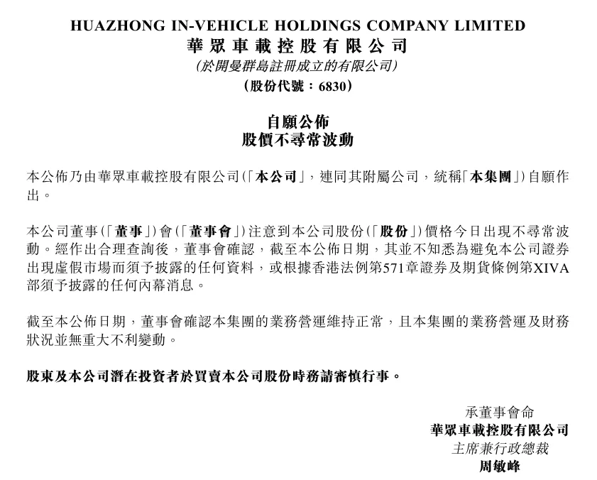股价闪崩后,华众车载午间在港交所公告,公司董事会注意到公司股份价格今日出现不寻常波动。经作出合理查询后,董事会确认,截至本公布日期,其并不知悉为避免公司证券出现虚假市场而须予披露的任何资料,或根据香港法例第571章证券及期货条例第XIVA部须予披露的任何内幕消息。截至本公布日期,董事会确认集团的业务营运维持正常,且集团的业务营运及财务状况并无重大不利变动。
