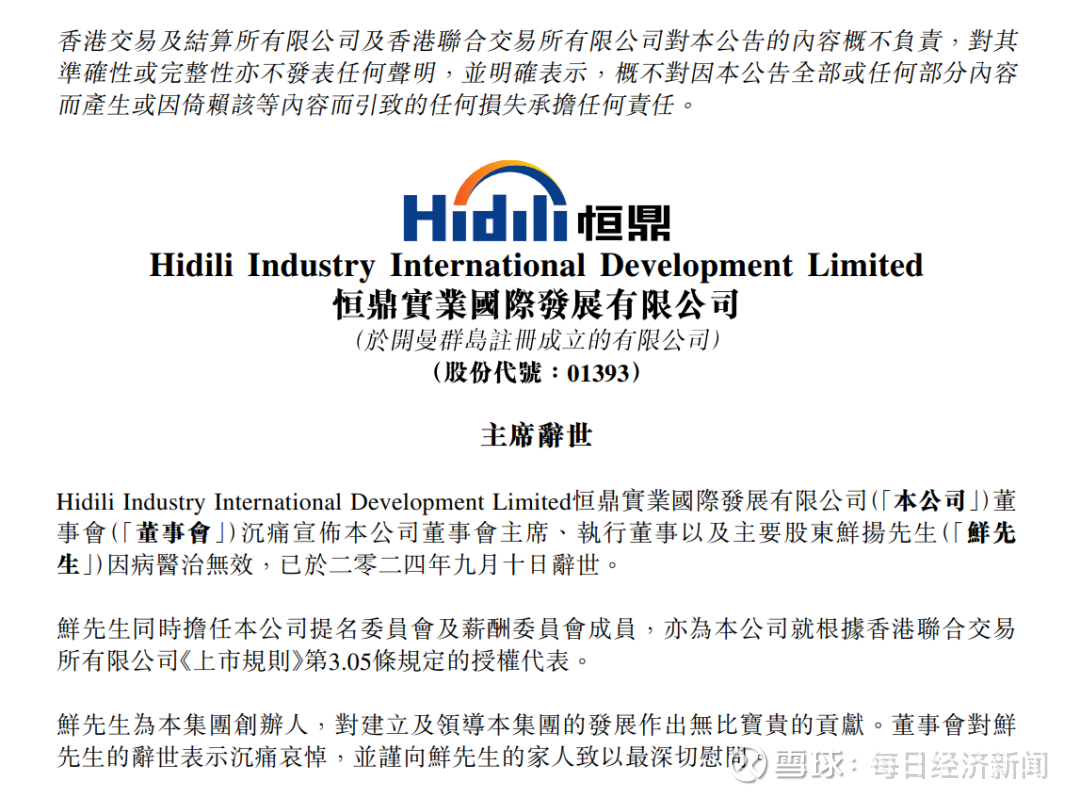恒鼎实业在公告中表示,鲜扬为本集团创办人,对建立及领导本集团的发展作出无比宝贵的贡献。董事会对鲜先生的辞世表示沉痛哀悼,并谨向鲜先生的家人致以最深切慰问。