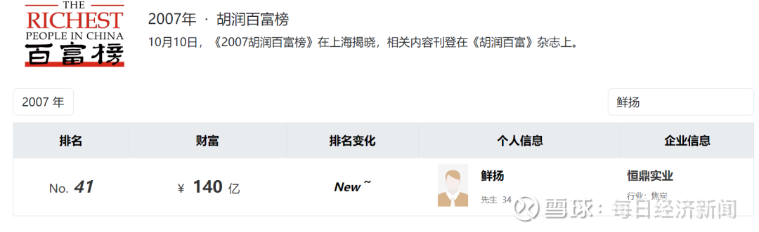 据《每日经济新闻》此前报道,多年以前,鲜扬以110万元起家,7年多时间从公务员变身百亿巨富,曾以“黑马”姿态登上福布斯“亚洲最年轻富豪”榜及胡润百富榜,被称为“黑金王子”。