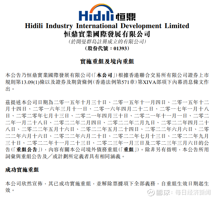 直到2023年3月31日,恒鼎实业终于发布公告称,其境内债务已成功实施重组。