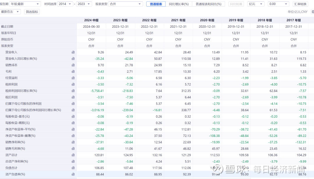 在连续亏损多年后,2021和2022年,恒鼎实业曾连续两年盈利。然而,自2023年起,恒鼎实业经营状况再次急转直下。根据其8月30日发布公告,截至2024年6月30日止六个月,实现收入9.26亿元,同比减少35.2%;毛损为4332.5万元,上年同期毛利为人民币2.91亿元;公司归母净亏损3.54亿元,总资产120.81亿元,资产负债率88.44%。而在2023年,恒鼎实业亦是大亏,全年净亏损达7.46亿元。