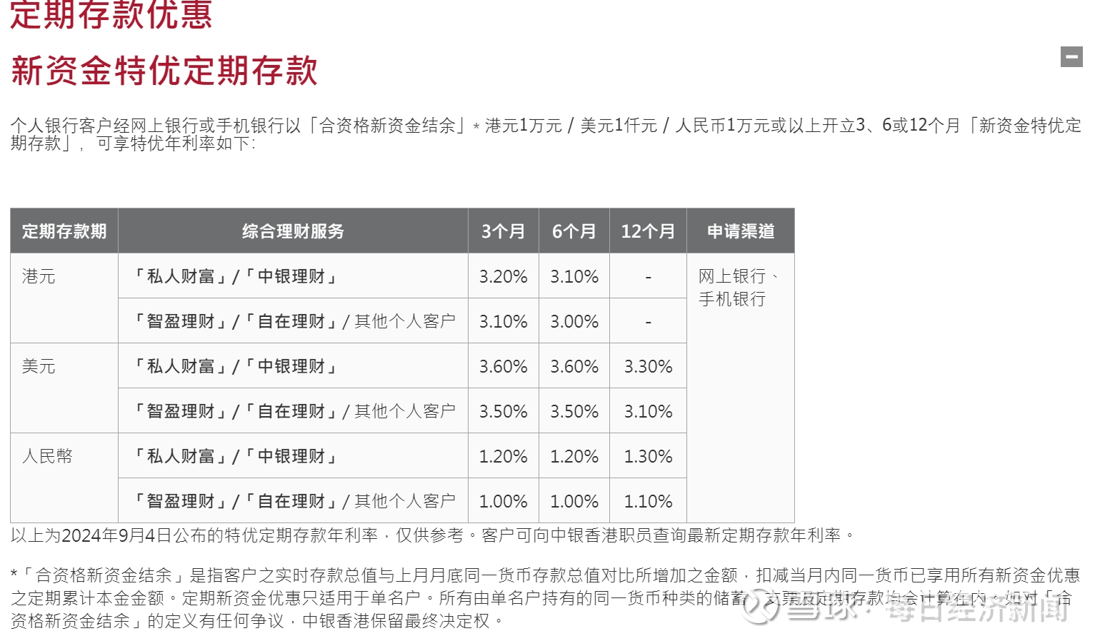 图片来源:中银香港官网 除了中银香港,工银亚洲定期存款利率也于9月17日进行了调整,目前港币3个月定期存款利率最高为3.4%。此外,渣打银行香港新资金开立的定期存款利率也于9月11日进行了调整,目前1万港元以上3个月定期特惠利率为3.2%。