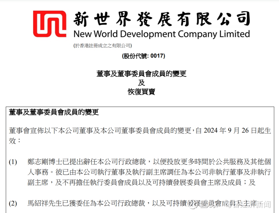 9月26日,新世界发展(HK00017,股价8.19港元,市值206.11亿港元)公告称,郑志刚已提出辞任公司行政总裁,以便投放更多时间于公共服务及其他个人事务。郑志刚已由公司执行董事及执行副主席调任为公司非执行董事及非执行副主席,不再担任执行委员会成员以及可持续发展委员会主席及成员。