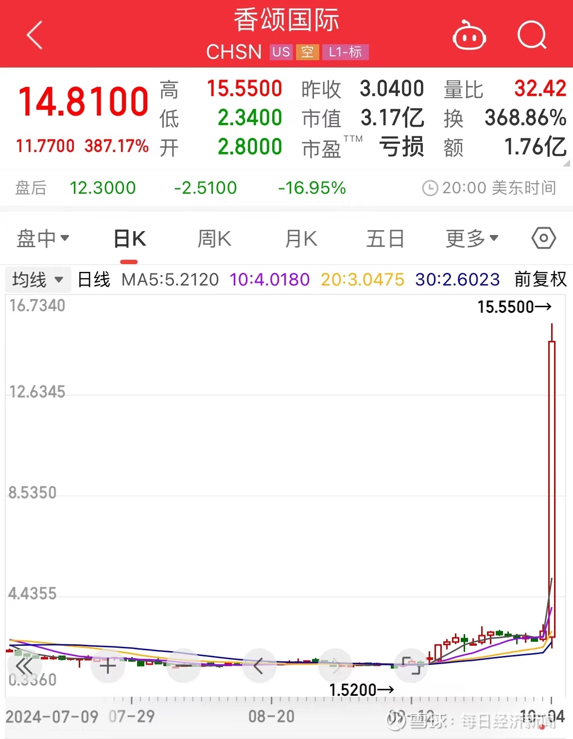 中概股继续走强,纳斯达克中国金龙指数周五涨逾3%,全周涨近12%,并连涨四周。香颂国际(CHSN)股价一夜大涨387.17%,领涨中概股。