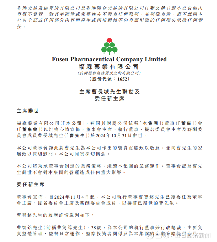 港股上市公司福森药业11月4日公告,公司董事会主席、执行董事、提名委员会主席及薪酬委员会成员曹长城于2024年10月31日辞世。