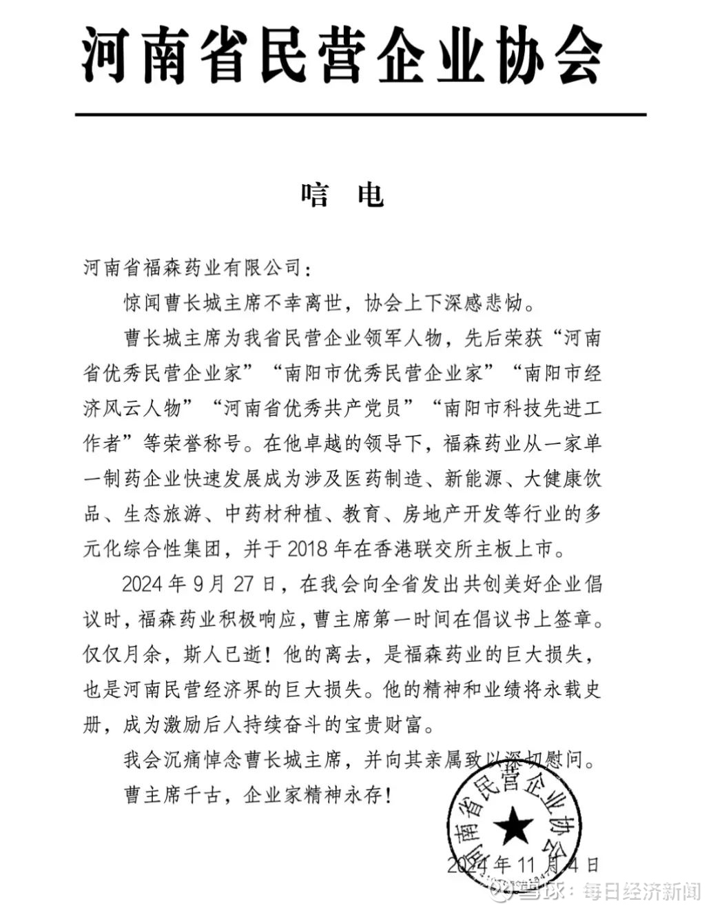 11月4日,河南省民营企业协会发文悼念曹长城。在唁电中,河南省民营企业协会表示,曹长城是河南省民营企业领军人物,先后荣获“河南省优秀民营企业家”“南阳市优秀民营企业家”“南阳市经济风云人物”“河南省优秀共产党员”“南阳市科技先进工作者”等荣誉称号。在他卓越的领导下,福森药业从一家单一制药企业快速发展成为涉及医药制造、新能源、大健康饮品、生态旅游、中药材种植、教育、房地产开发等行业的多元化综合性集团,并于2018年在香港联交所主板上市。