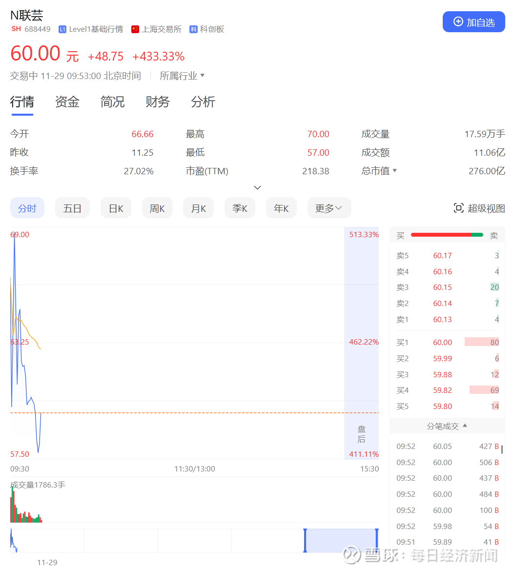 N联芸今日上市,开盘价66.66元,上涨492.53%,截至发稿涨433.33%,股价报60.00元。