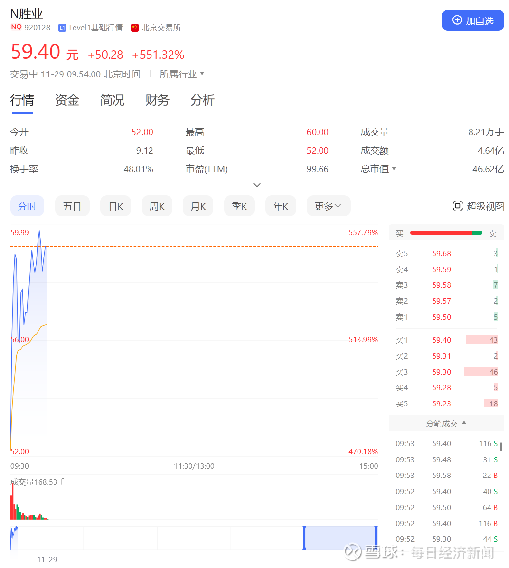 N胜业(920128)今日在北交所上市,开盘价52.00元,上涨470.18%,截至发稿涨551.32%,股价报59.4元。