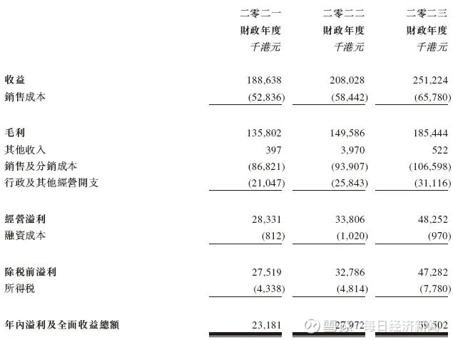 2021年至2023年,草姬集团的营收分别约为1.89亿港元、2.08亿港元、2.51亿港元;净利润分别约为2318.1万港元、2797.2万港元、3950.2万港元。毛利率分别为71.99%、71.91%、73.82%。