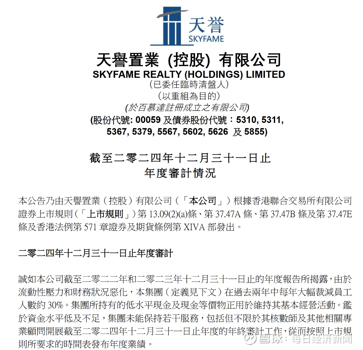 2月11日,天誉置业披露了截至2024年12月31日止年度的审计情况指出,监于资金水平低及不足,集团未能保持若干服务,包括但不限于其核数师及其他相关专业顾问开展截至2024年12月31日止年度的年终审计工作,从而按照上市规则所要求的时间表发布年度业绩。由于流动性压力和财务状况恶化,集团在过去两年中每年大幅裁减员工人数约30%。集团所持有的低水平现金及现金等价物正用于维持其基本经营活动。