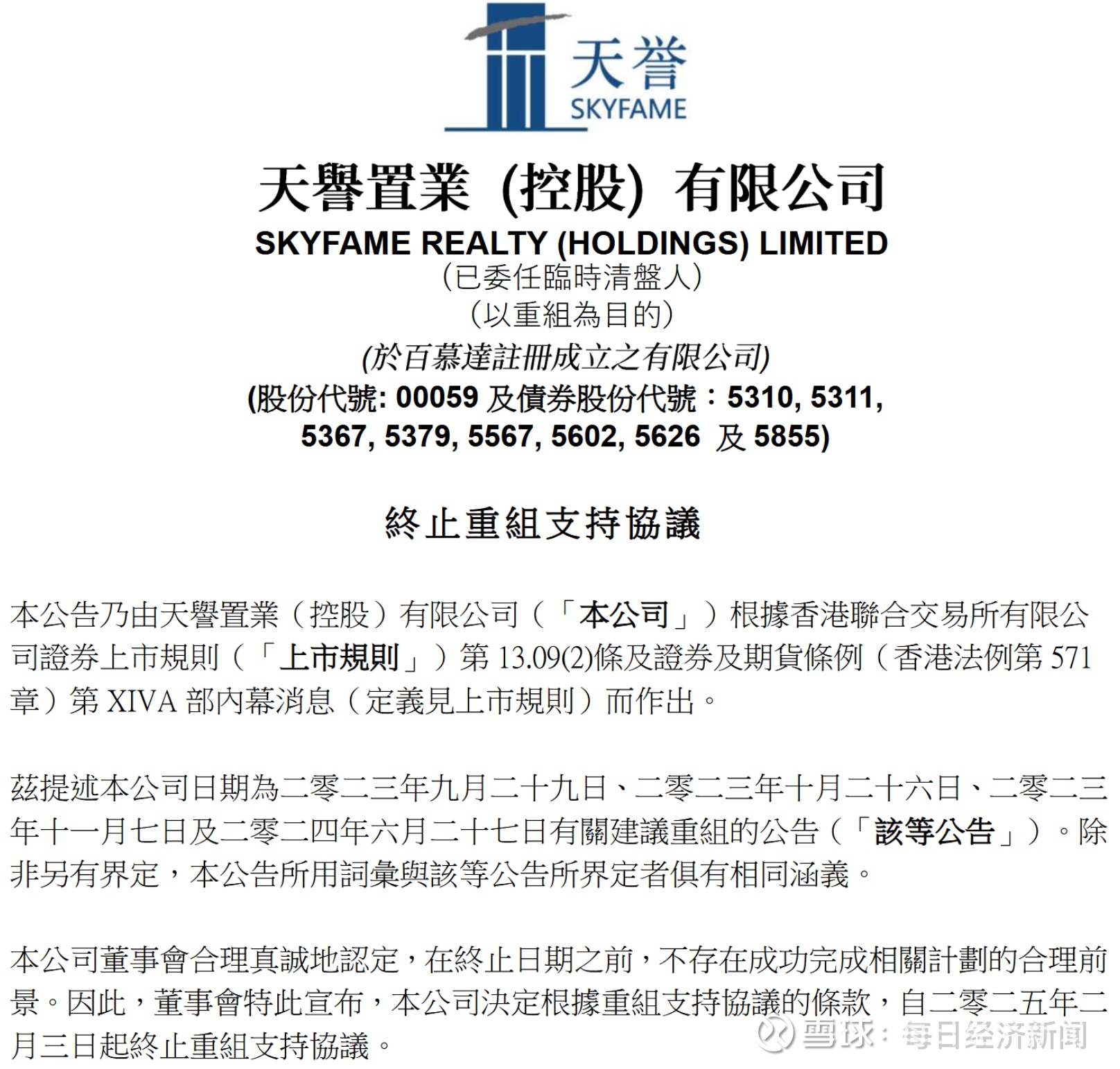 2月3日晚间,天誉置业就其进行了两年多的债务重组情况进行了最新说明,宣布终止重组支持协议。天誉置业认为,在终止日期之前,不存在成功完成相关计划的合理前景。因此,天誉置业董事会特此宣布,公司决定根据重组支持协议的条款,自2025年2月3日起终止重组支持协议。