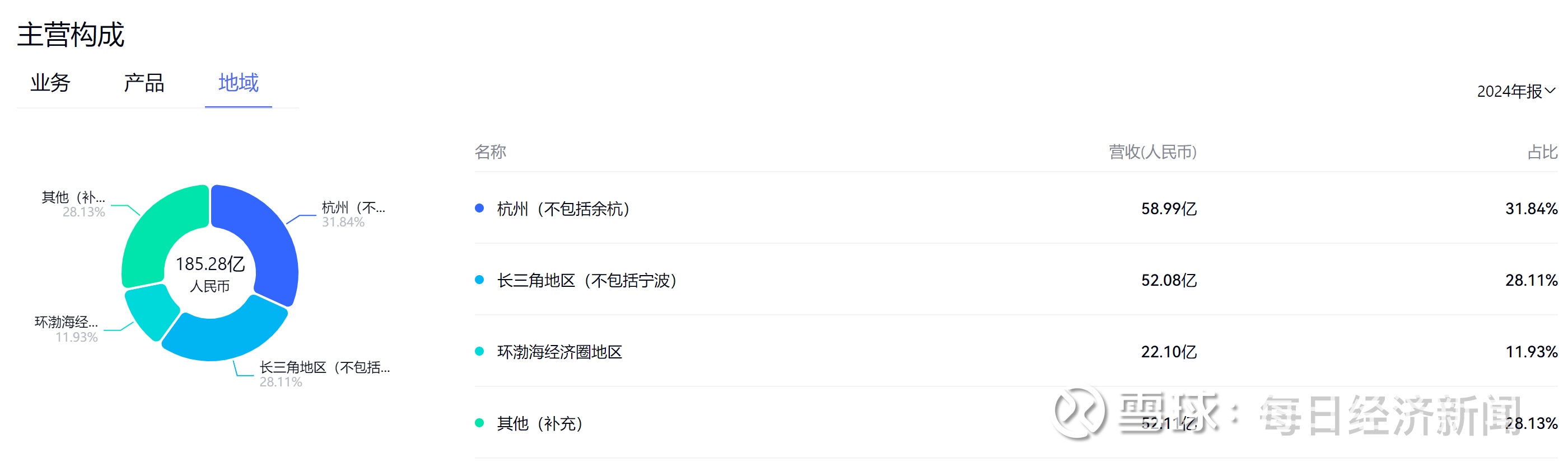 从在管面积结构来看,截至报告期末,杭州占比16.6%,宁波占比7%,长三角其他城市占比35%,整个长三角合计占比达到58.6%。从对应的收入结构来看,杭州占比36.1%,宁波占比5.7%,长三角其他城市占比27.5%,合计占该板块收入的69.3%。