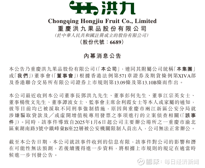 今日,重庆洪九果品股份有限公司(以下简称“洪九果品,06689.HK)发布公告,公司董事长邓洪九,董事彭何、江宗英、杨俊文、谭波及监事会主席余利霞女士等,目前均已被采取不同刑事强制措施,原因与重庆市两江新区公安分局就涉嫌骗取贷款及/或虚开增值税专用发票之事项进行的立案侦查相关。