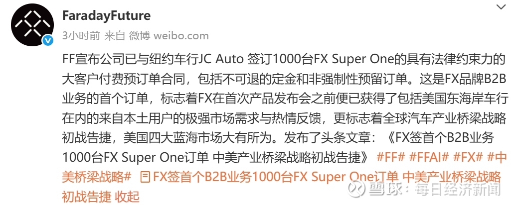据法拉第未来微博4月30日消息,FF宣布公司已与纽约车行JC Auto签订1000台FX Super One的具有法律约束力的大客户付费预订单合同,包括不可退的定金和非强制性预留订单。