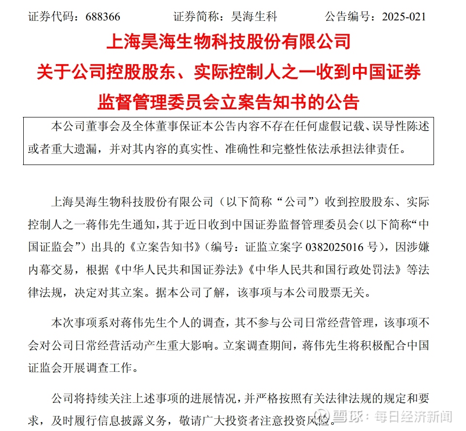 5月7日,昊海生科(688366.SH,股价53.17元,市值123.99亿元)公告称,公司收到控股股东、实际控制人之一蒋伟通知,其于近日收到中国证监会出具的《立案告知书》,因涉嫌内幕交易,决定对其立案。据了解,该事项与公司股票无关。