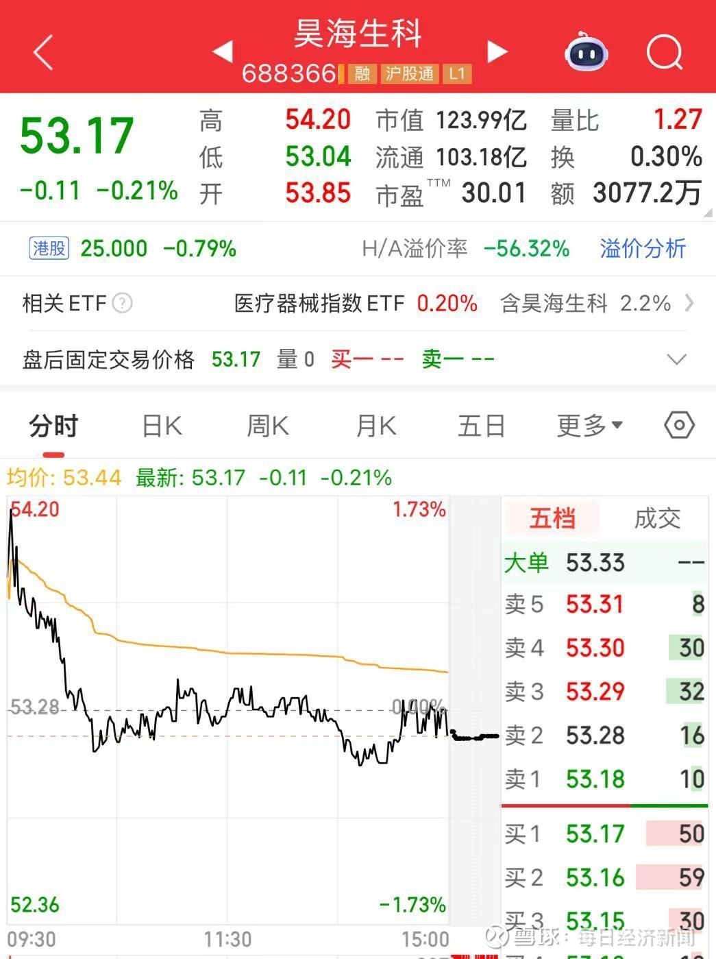 截至5月7日A股收盘,昊海生科股价下跌0.21%。