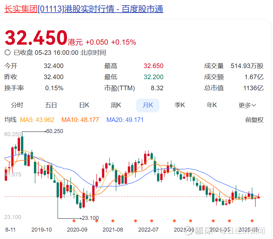 5月22日,长实集团股价跌1.67%,23日微涨0.15%。