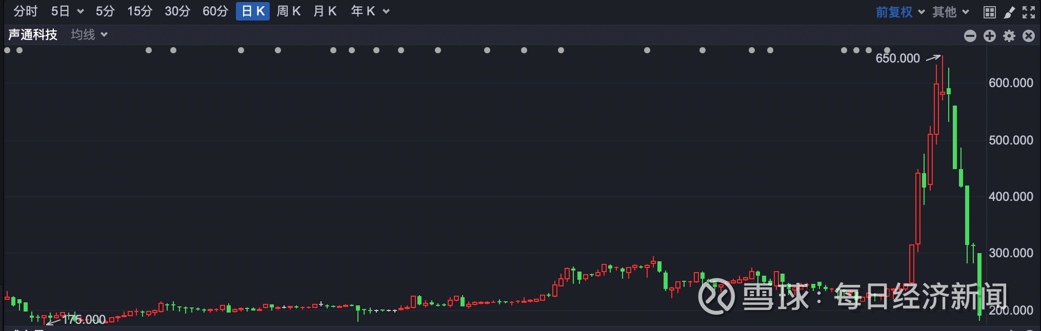 大跌:7天跌回“原点”5月19日,声通科技盘中股价触及高点650港元之后,随即开启下跌走势——5月21日,声通科技大跌22%;5月22日,下跌6.56%;5月23日,再下跌近25%;今日盘中,再度下跌超40%。短短7个交易日,累计跌幅超过70%。