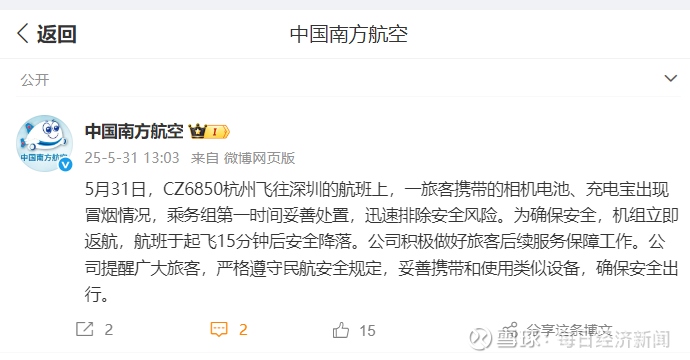 5月31日,中国南方航空发文:CZ6850杭州飞往深圳的航班上,一旅客携带的相机电池、充电宝出现冒烟情况,乘务组第一时间妥善处置,迅速排除安全风险。为确保安全,机组立即返航,航班于起飞15分钟后安全降落。