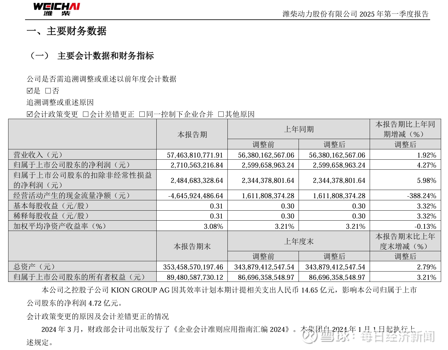 其中,潍柴动力报告期内实现营业收入574.64亿元,同比增长1.92%;归母净利润27.11亿元,同比增幅4.27%,利润增速跑赢收入增速。若剔除子公司凯傲集团相关支出影响,潍柴动力今年一季度的归母净利润增速实际已提升到了22.42%,基本回到2018年的增速水平。