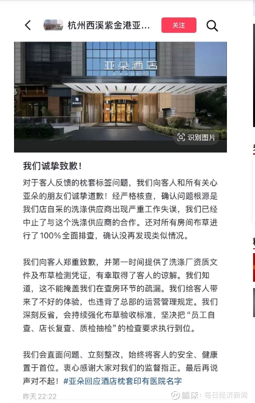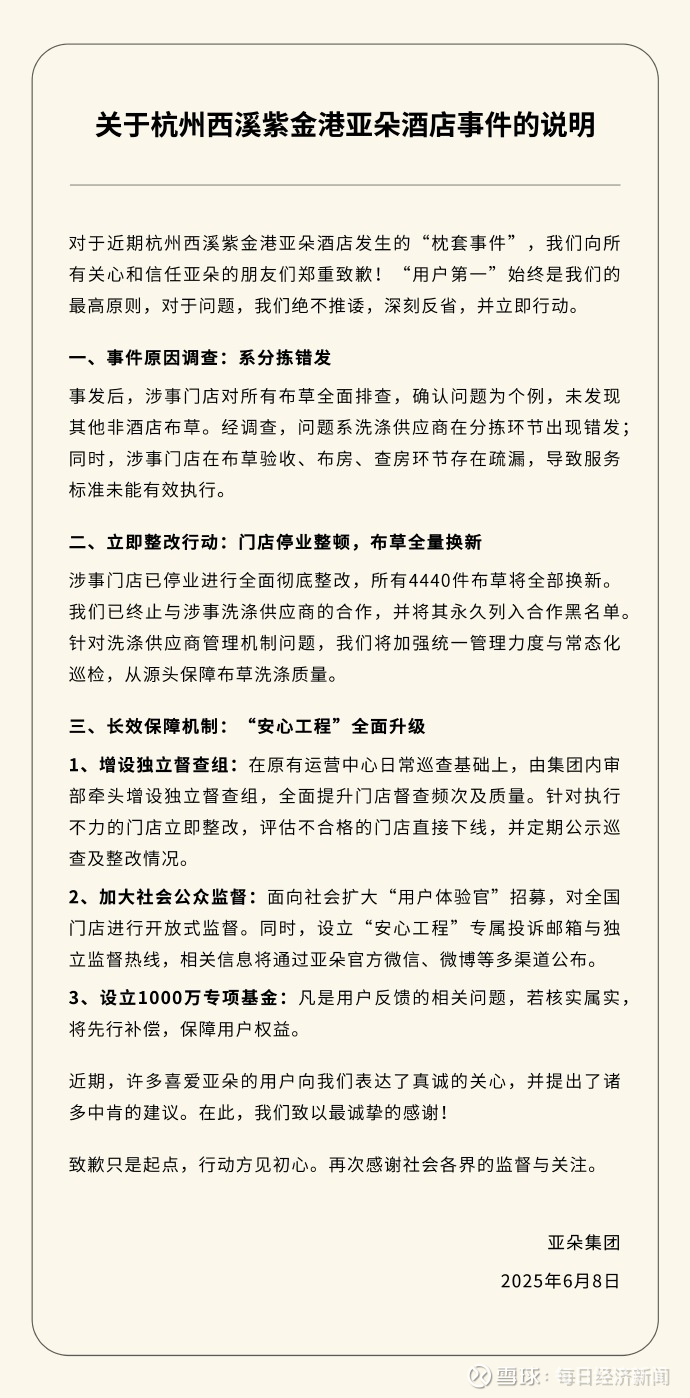 6月8日,亚朵发布关于杭州西溪紫金港亚朵酒店 “枕套事件” 的声明:系分拣错发,门店停业整顿。