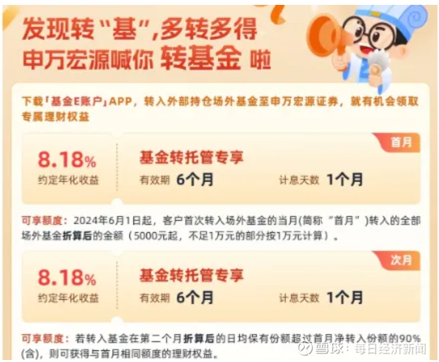 申万宏源当前就通过基金转托管理财券,把抢客户这件事拉出了新的高度!大致情况是,如果你在任何平台持有价值不低于5000元的场外股票型基金,将这些基金转托管到申万宏源,申万宏源就会给你同等资金额度、年化收益高达8.18%的理财券,而且这样的理财券可以连续购买2个月。
