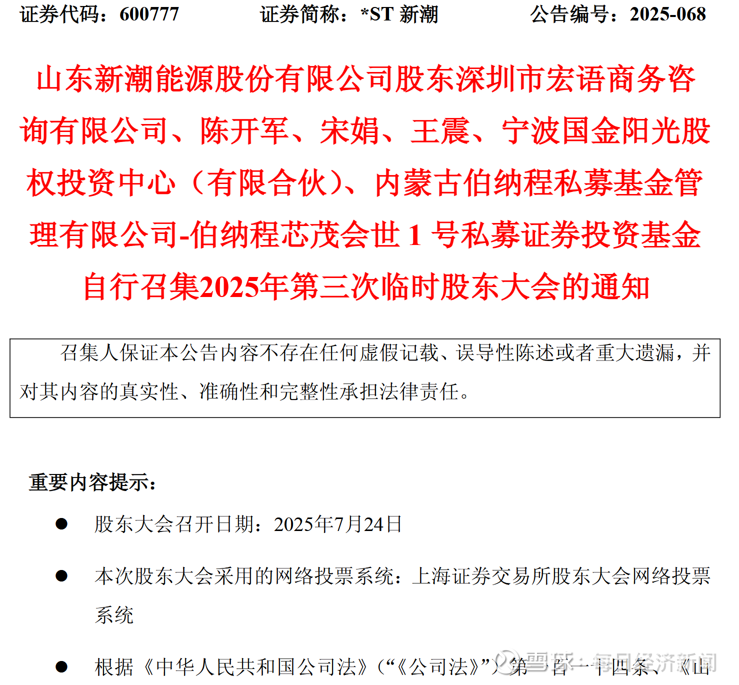 根据新潮能源7月9日公告,公司7月8日收到深圳市宏语商务咨询有限公司、宁波国金阳光股权投资中心(有限合伙)、内蒙古伯纳程私募基金管理有限公司-伯纳程芯茂会世1号私募证券投资基金、陈开军、宋娟、王震等6名股东(以下简称“召集人”或“提请召集人”)提交的《关于股东自行召集召开公司2025年第三次临时股东大会的函》(以下简称《自行召集召开函件》)等文件。