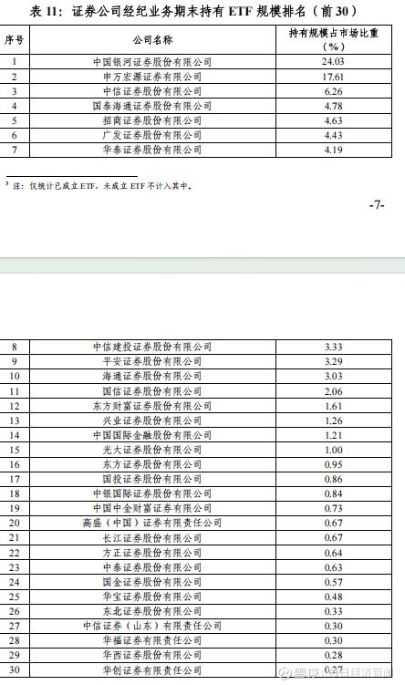 成交规模:双寡头格局未改,但占比略降上交所的最新数据显示,截至2025年6月末,在证券公司经纪业务期末持有ETF规模排名里,中国银河证券仍然是一骑绝尘,以24.03%的持有规模占市场比重占据首位。不过和5月末的24.63%相比,下降了0.6个百分点。另一寡头申万宏源证券持有ETF规模的占比也从5月末的18.05%,降至17.61%。中信证券在6月末持有ETF规模的占比则是微微上涨至6.26%。