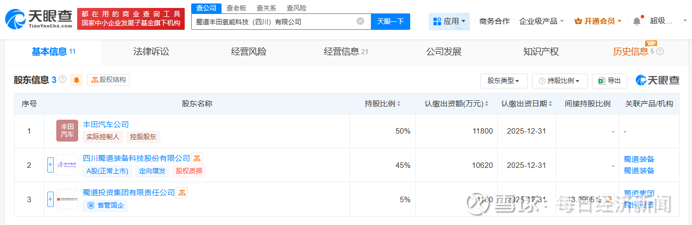 每经AI快讯,天眼查App显示,近日,蜀道丰田氢能科技(四川)有限公司成立,法定代表人为胡圣厦,注册资本2.36亿元人民币,经营范围包括电池制造、电池销售、汽车零配件批发、电动汽车充电基础设施运营等。股东信息显示,该公司由丰田汽车公司、蜀道装备(300540)、蜀道投资集团有限责任公司共同持股。