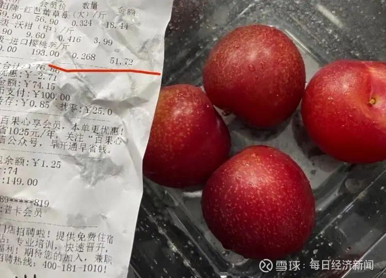 5月份有消费者向记者展示购物小票,她在百果园买了四个进口樱桃李,花了51元。