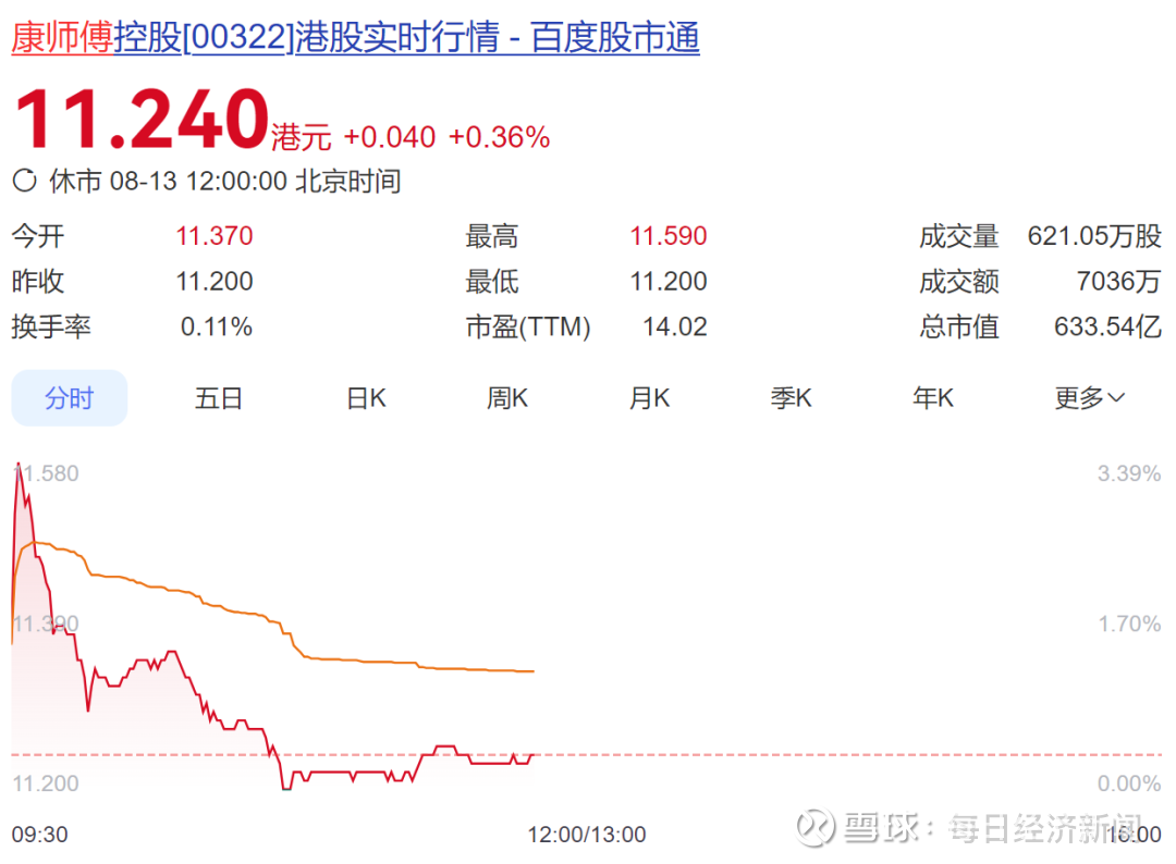 市场方面,截至发稿,康师傅控股午盘报11.24港元,上涨0.36%,最新市值633亿港元。