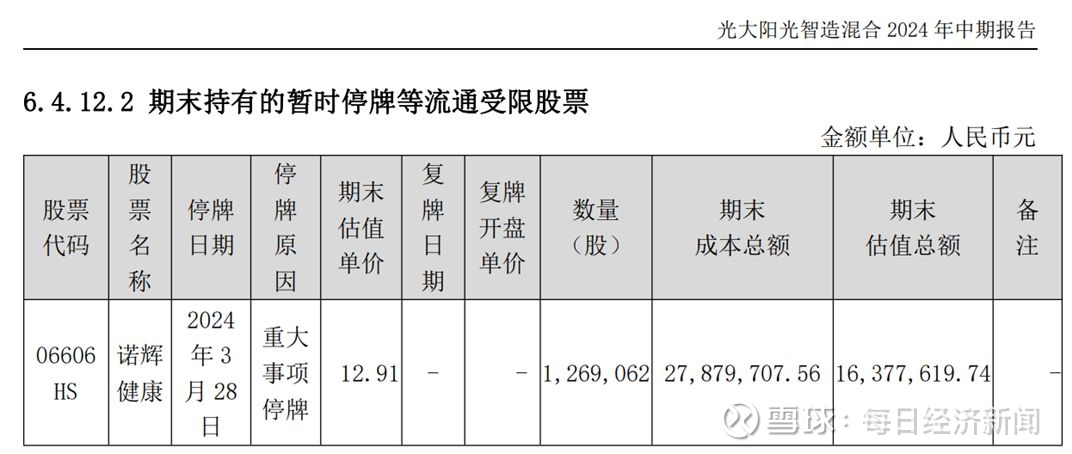 然而,2024年3月28日,诺辉健康突然停牌,持仓随即“冰封”。光大阳光智造2024年中报显示,期末持有诺辉健康126.91万股,期末成本总额为2787.97万元,期末估值总额却仅为1637.76万元,缩水逾四成。