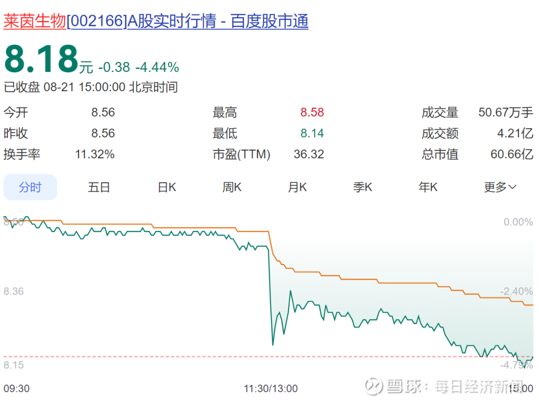 8月21日,莱茵生物收跌4.44%,报8.18元/股,总市值61亿元。值得注意的是,莱茵生物股价在午后开盘直线跳水。
