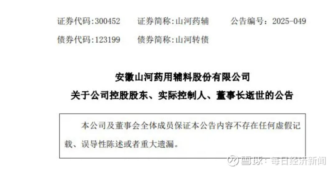 安徽山河药用辅料股份有限公司(下称山河药辅或公司)27日早间公告,公司控股股东、实际控制人、董事长尹正龙逝世。